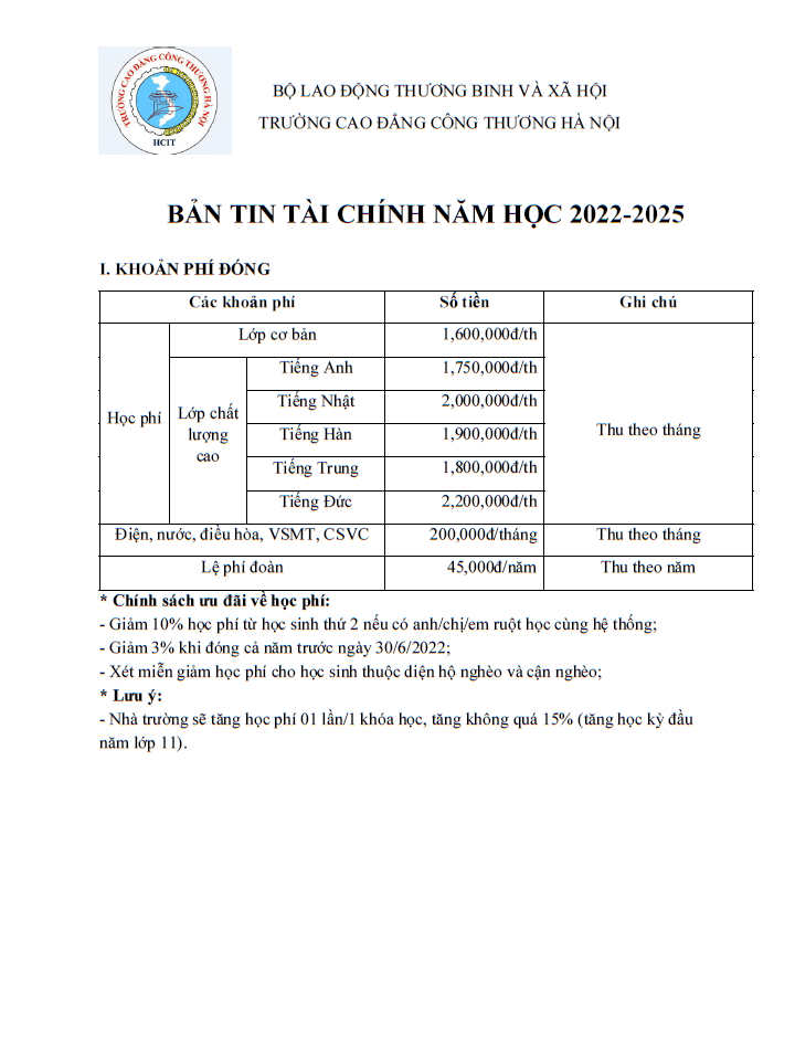 Bản tin tài chính năm học 2022 - 2025 hệ đào tạo 2 văn bằng Trường cao đẳng công thương Hà Nội