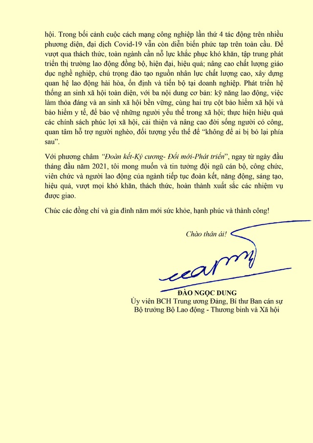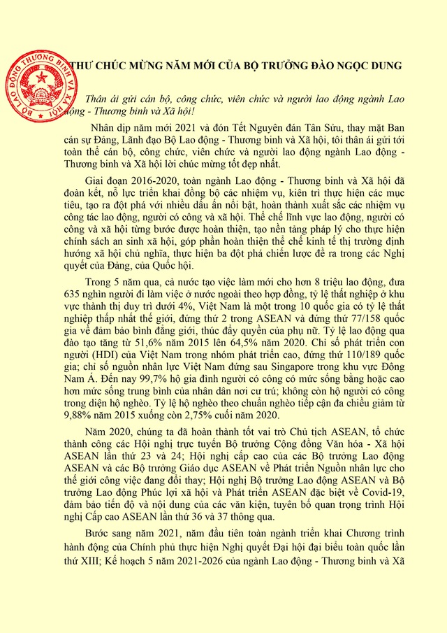 Dân trí – Nhân dịp Tết Nguyên đán Tân Sửu năm 2021, Bộ trưởng Bộ Lao động – Thương binh và Xã hội Đào Ngọc Dung đã gửi thư chúc Tết tới cán bộ, công chức, viên chức và người lao động trong Ngành.