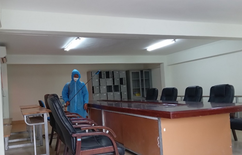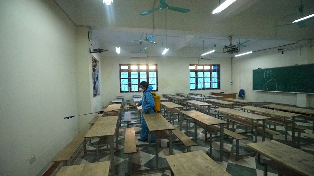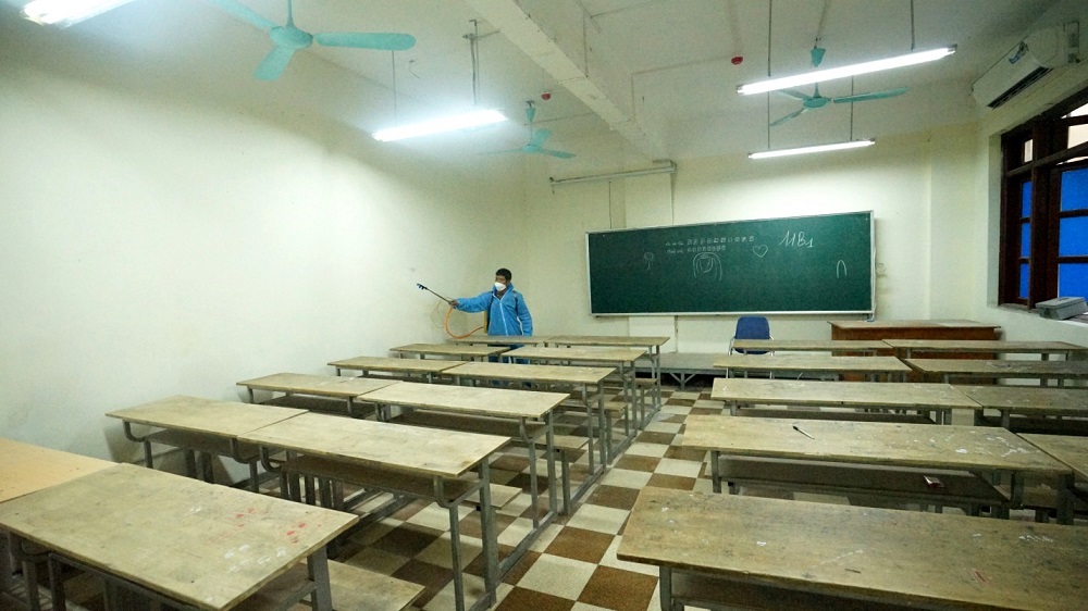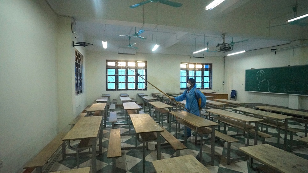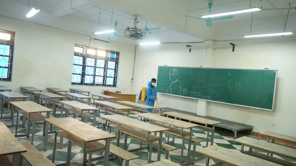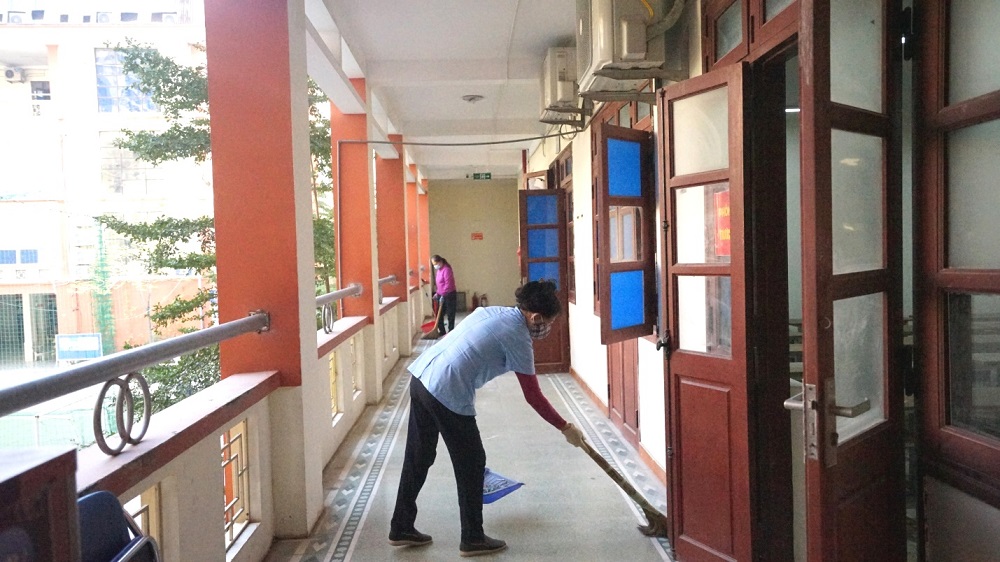 c) Ngắt điện máy điều hòa tất cả các phòng học; cắt nước các cây nước dùng chung tại các hành lang; Tổ chức phun khử khuẩn phòng, chống dịch COVID-19, vệ sinh lau chùi lớp học, bàn ghế, bục bảng,…;