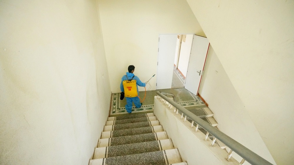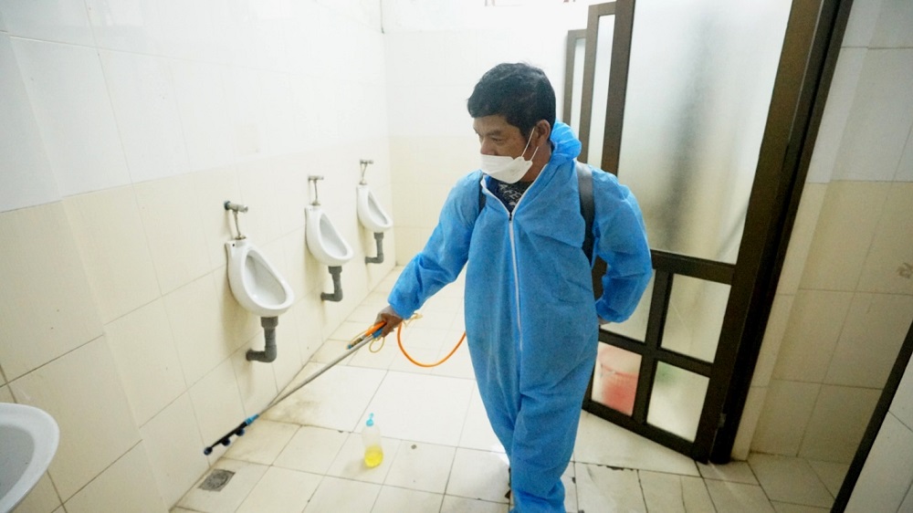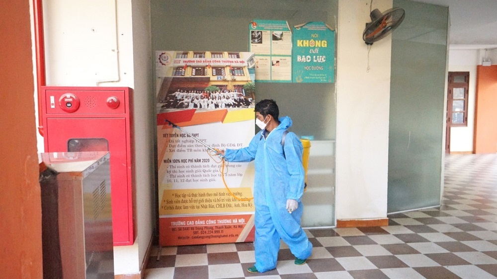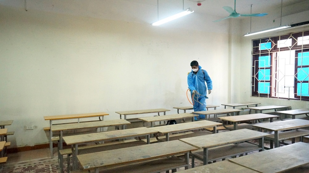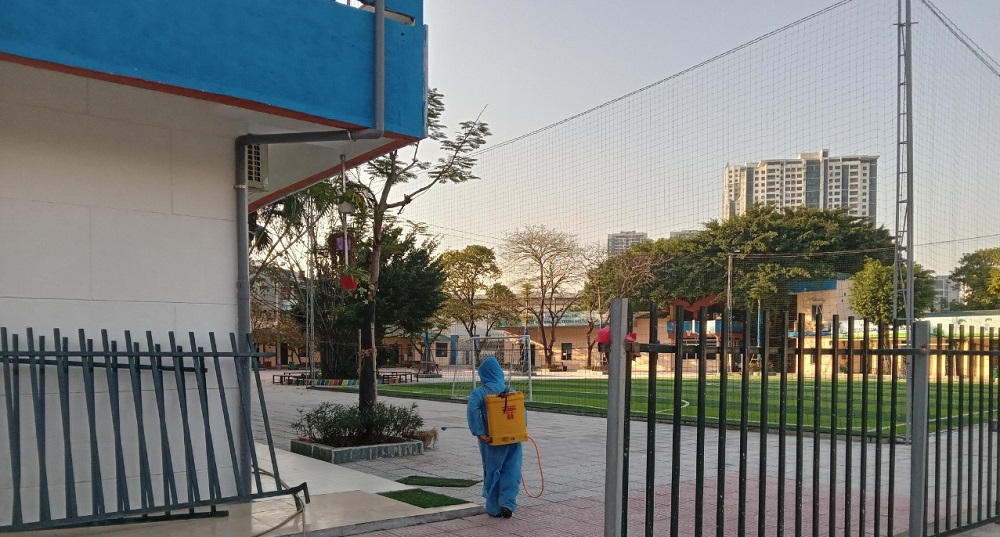 Hình ảnh vệ sinh phun thuốc sát khuẩn toàn bộ khuôn viên trường: