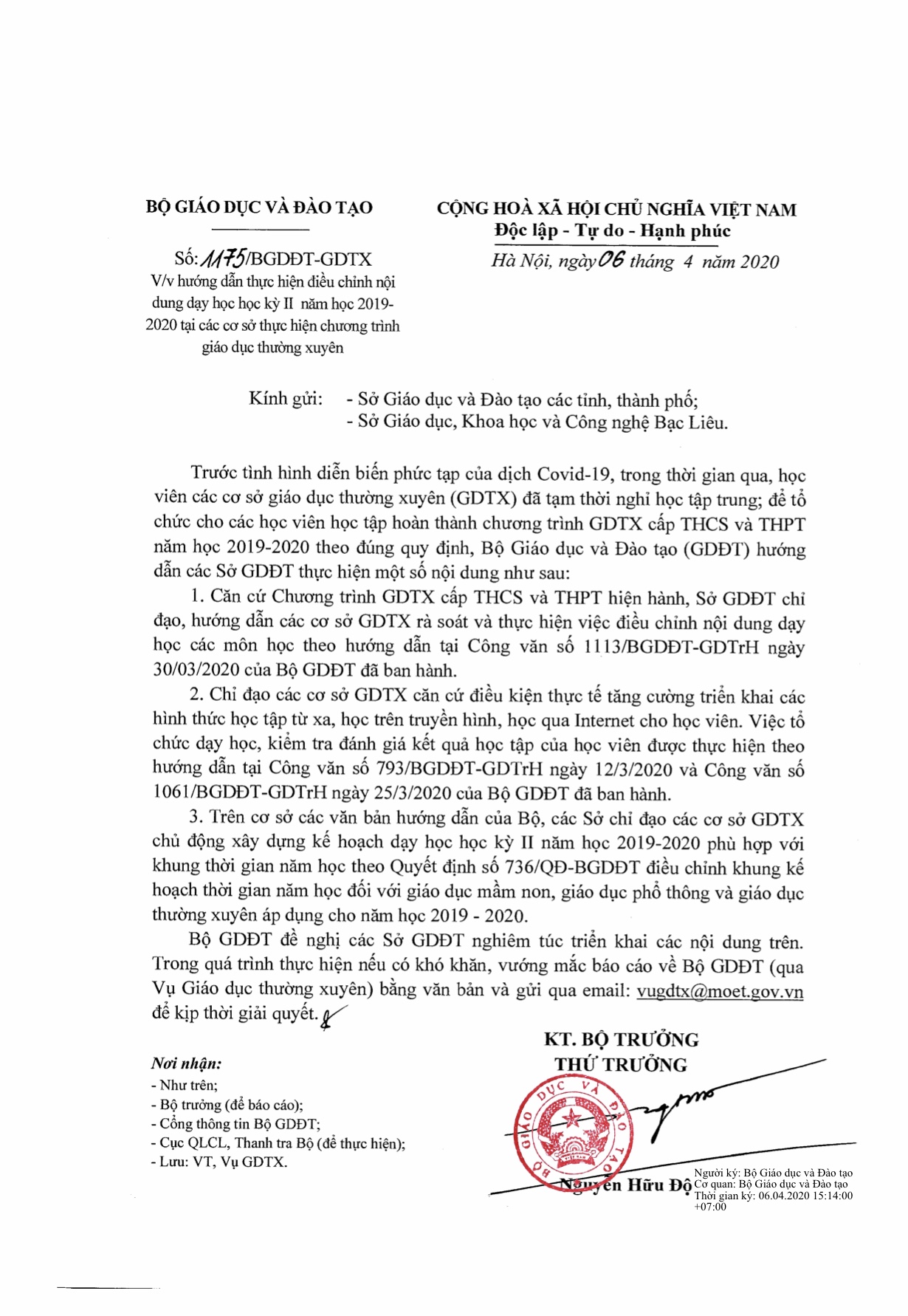 Công văn 1175 của Bộ GD&ĐT hướng dẫn thực hiện chương trình GDTX học kỳ II năm học 2019-202018:22 - 09/04/2020 Chia sẻ: