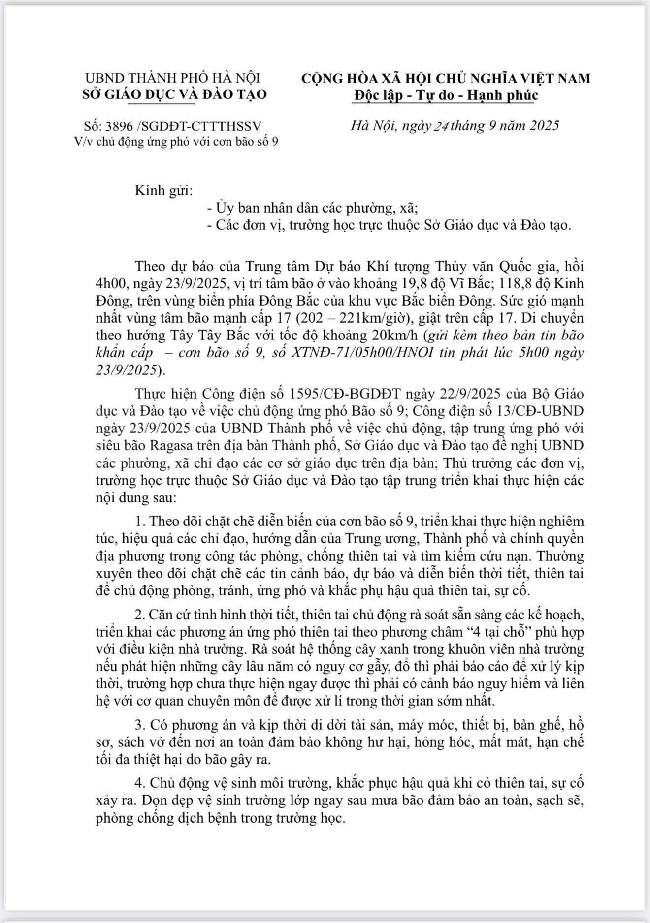 Công văn số 3896 của Sở Giáo dục và Đào tạo về việc ứng phó với cơn bão số 9Tác giảTrung Tâm Thông tin &Truyền thông10:35 - 25/09/2025Công văn số 3896 của Sở Giáo dục và Đào tạo về việc ứng phó với cơn bão số 9 Chia sẻ: