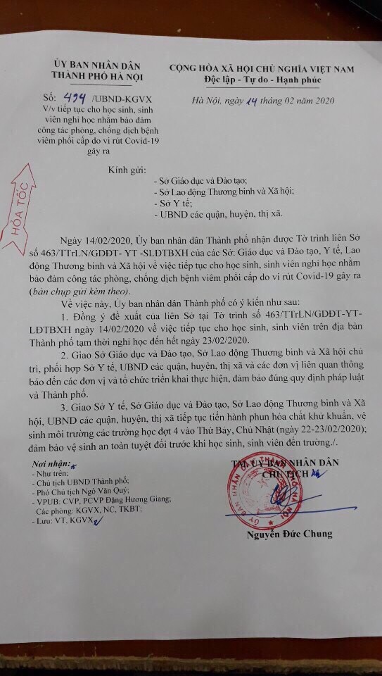 Công văn số 494 của UBND TPHN v/v cho học sinh, sinh viên tiếp tục nghỉ học02:00 - 15/02/2020 Chia sẻ: