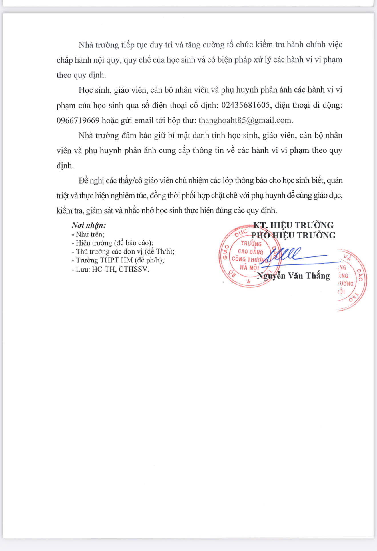 Công văn số 719  Phòng CT HSSV Trường Cao đẳng Công thương Hà Nội về việc tăng cường kiểm tra, giám sát thực hiện nội quy, quy chế