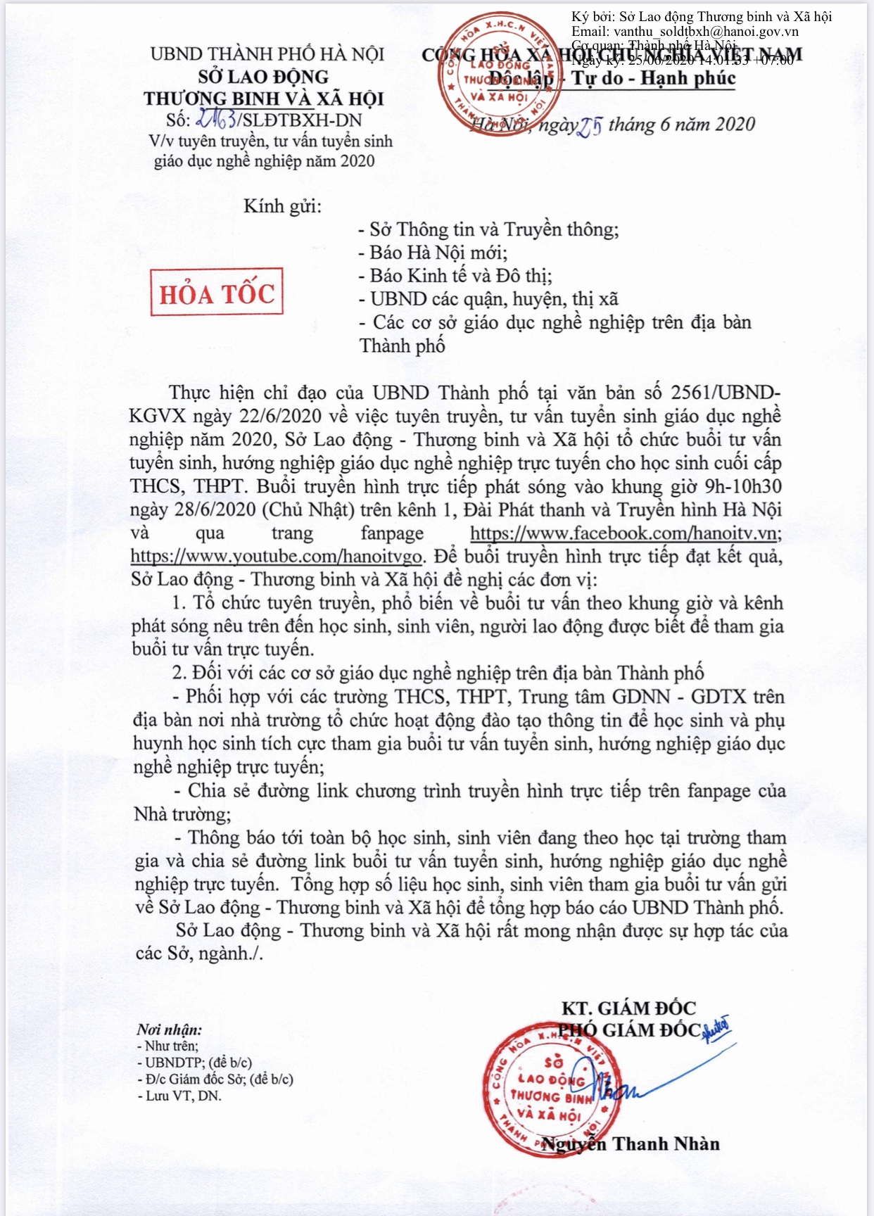 CV SỐ 2163 NGÀY 25/06/2020 CỦA SLĐTBXH V/V TUYÊN TRUYỀN, TƯ VẤN TUYỂN SINH GIÁO DỤC NGHỀ NGHIỆP NĂM 202022:54 - 26/06/2020Chia sẻ: