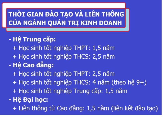 | Theo ông Võ Công Trí, Phó giám đốc Tuyển sinh – Truyền thông trường Cao đẳng Bách Khoa Sài Gòn, ngành quản trị kinh doanh là một trong số ít ngành có hệ thống đào tạo liên thông với nhiều trình độ nghề khác nhau, từ trung cấp cho đến đại học.