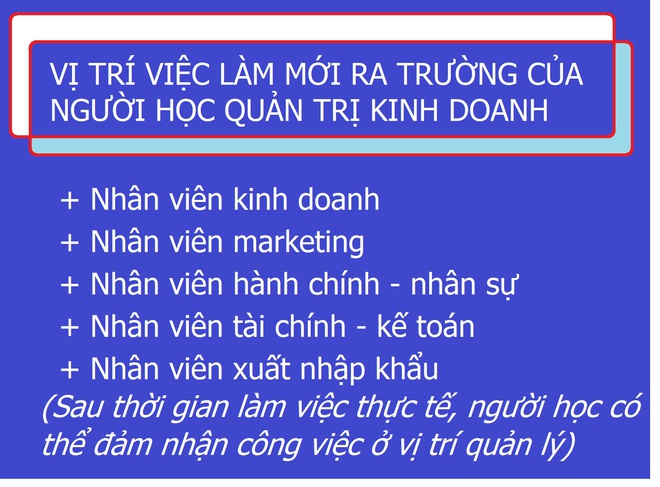Theo ông Hưng, người học quản trị kinh doanh mới tốt nghiệp ra trường có thể đảm nhận nhiều vị trí công việc tại các công ty. Cụ thể như nhân viên kinh doanh, marketing, hành chính – nhân sự, tài chính – kế toán, xuất nhập khẩu..