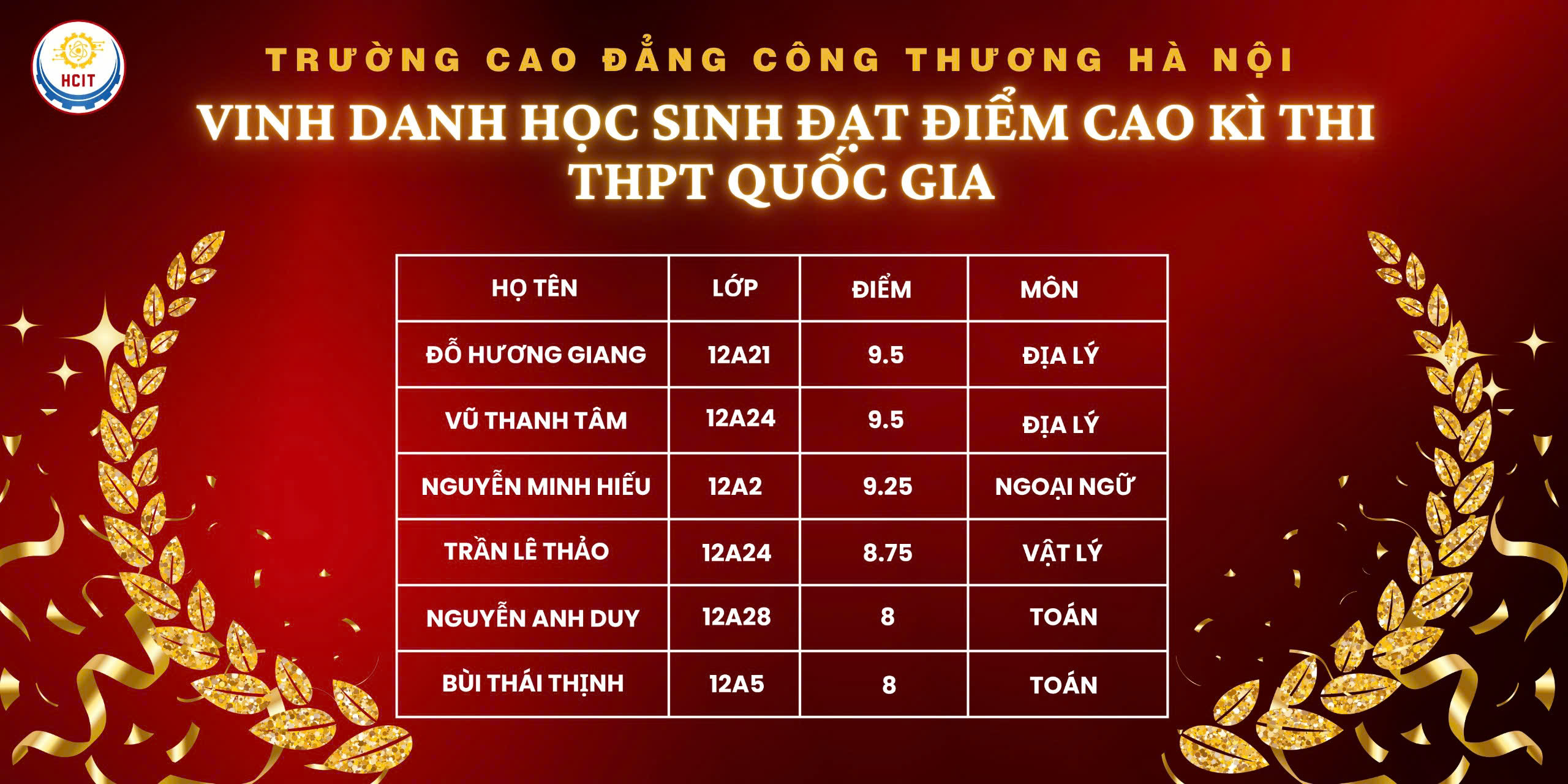 Dưới đây là Danh sách học sinh đạt điểm cao tại Kỳ thi tốt nghiệp THPT Quốc Gia năm 2025 của Trường Cao đẳng Công thương Hà Nội.