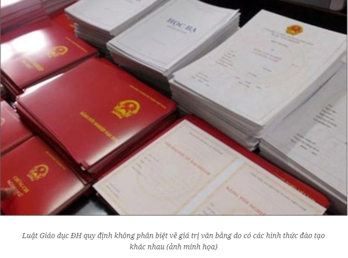 Theo đó, Luật Giáo dục ĐH quy định không phân biệt về giá trị văn bằng do có các hình thức đào tạo khác nhau. Như vậy, văn bằng hệ đào tạo ĐH chính quy so với các hệ đào tạo Tại chức, văng bằng 2, liên thông, từ xa… có giá trị như nhau.