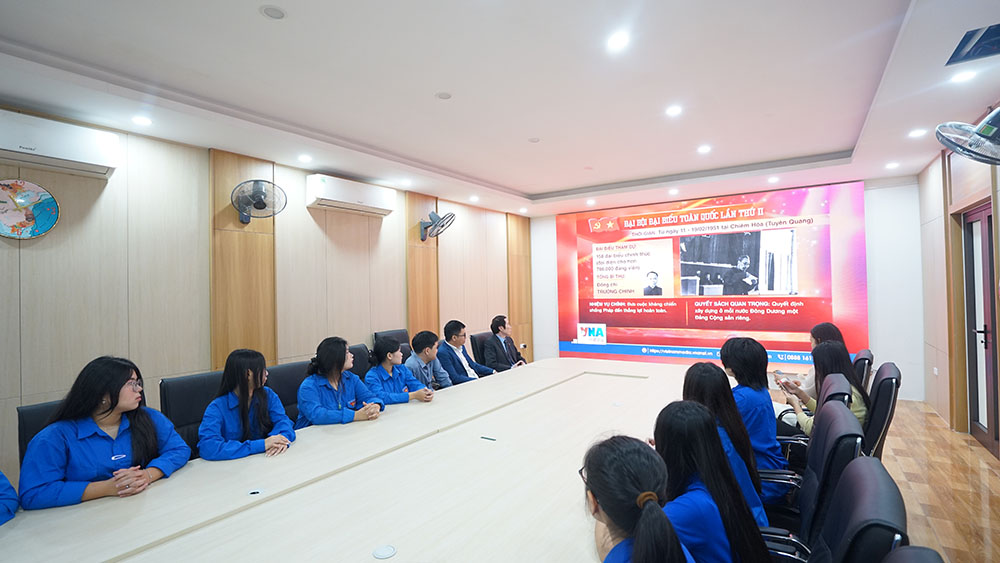 Các đại biểu và các em học sinh xem video về các kỳ Đại hội Đảng
