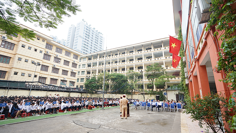 Tại buổi lễ chào cờ đầu tháng 10, đồng chí Đại úy Nguyễn Quỳnh Chi và đồng chí Đại úy Trần Đức Toàn – Phòng Cảnh sát Giao thông, Công an Quận Thanh Xuân đã trực tiếp phổ biến, hướng dẫn, chia sẻ với các em học sinh khối 11 những kiến thức cơ bản về an toàn giao thông, các loại biển báo quy định trong Luật giao thông đường bộ.