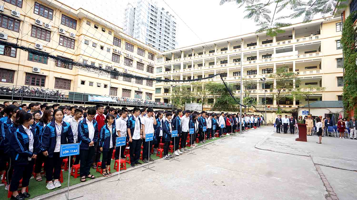 Tham dự Lễ chào cờ có toàn thể các thầy cô trong ban Giám hiệu, trưởng phó các phòng ban, cán bộ chuyên viên, các thầy cô giáo và toàn thể học sinh khối 11 hệ THPT và hệ hai văn bằng.
