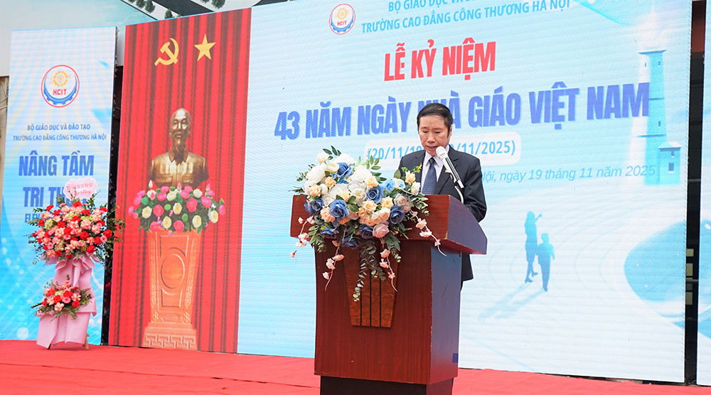 Thay mặt Lãnh đạo trường, PGS.TS.NGƯT. Ngô Kim Khôi – Bí thư chi bộ, Hiệu trưởng Trường Cao đẳng công thương Hà Nội đọc diễn văn chào mừng kỷ niệm 43 năm ngày Nhà giáo Việt Nam (20/11/1982 - 20/11/2025).