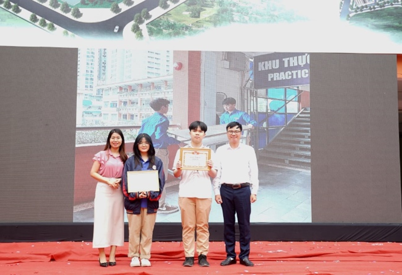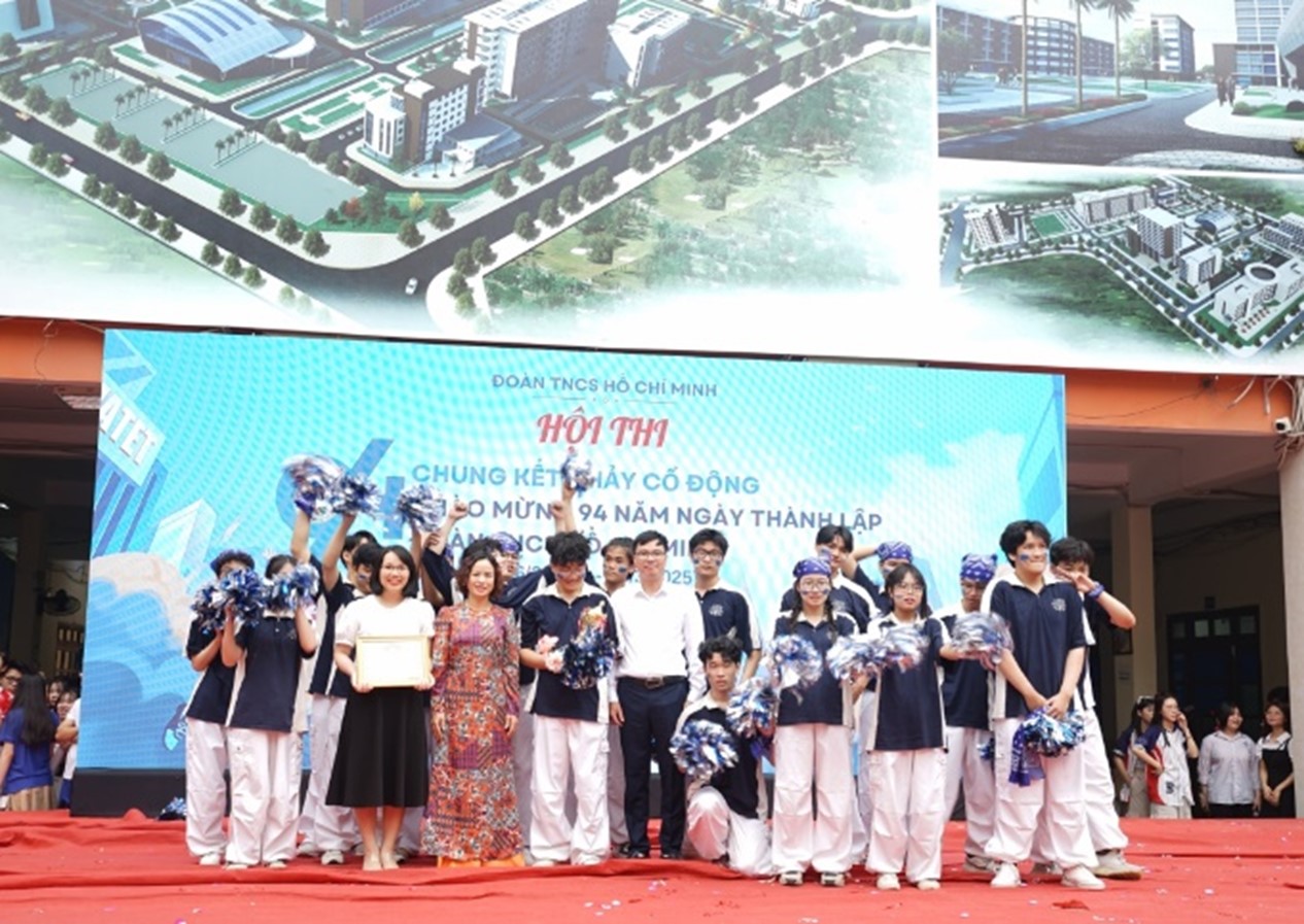 Đại diện Hội đồng trường và BGH trao giấy khen và chụp ảnh lưu niệm với đội đạt giải Nhất cuộc thi Nhảy cổ động
