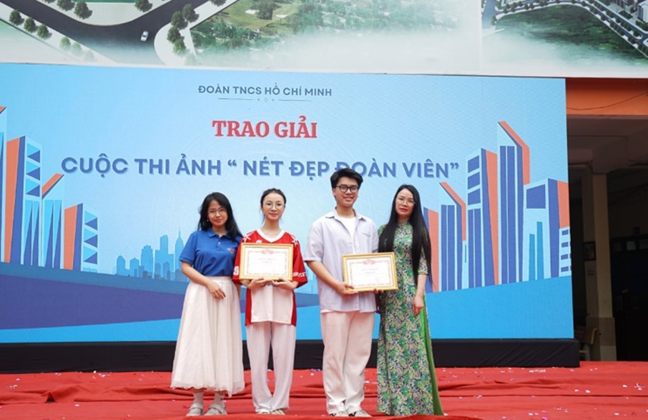 Đại diện BCH Đoàn trường trao giấy khen và chụp ảnh lưu niệm với các đoàn viên đạt thành tích trong cuộc thi ảnh “Nét đẹp đoàn viên”