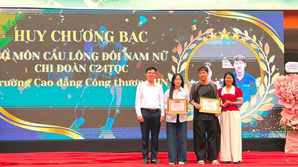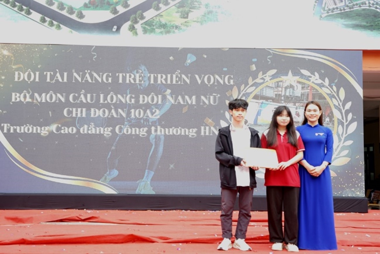 Đại diện BGH và phòng Công tác HSSV và KNST tặng giấy khen cho đội cầu lông đôi nam nữ giành Huy chương bạc