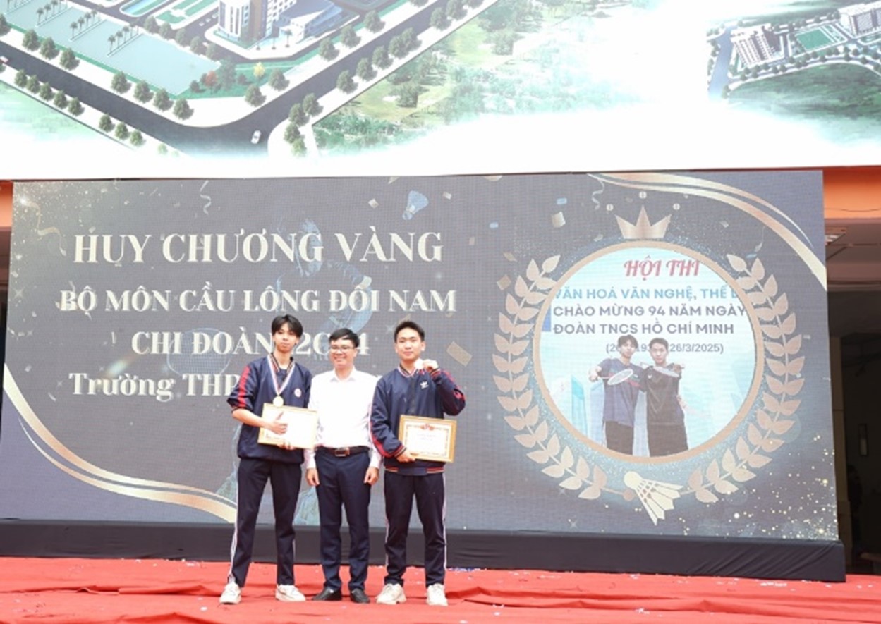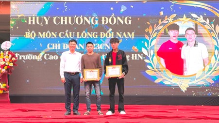 Đại điện BGH trường trao giấy khen cho đội đạt Huy chương vàng môn cầu lông đôi nam