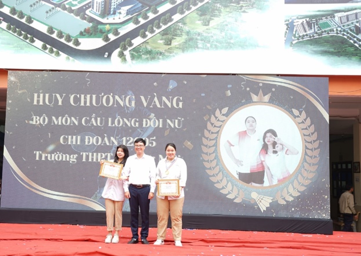 Đại điện BGH trường trao giấy khen cho đội đạt Huy chương vàng môn cầu lông đôi nữ