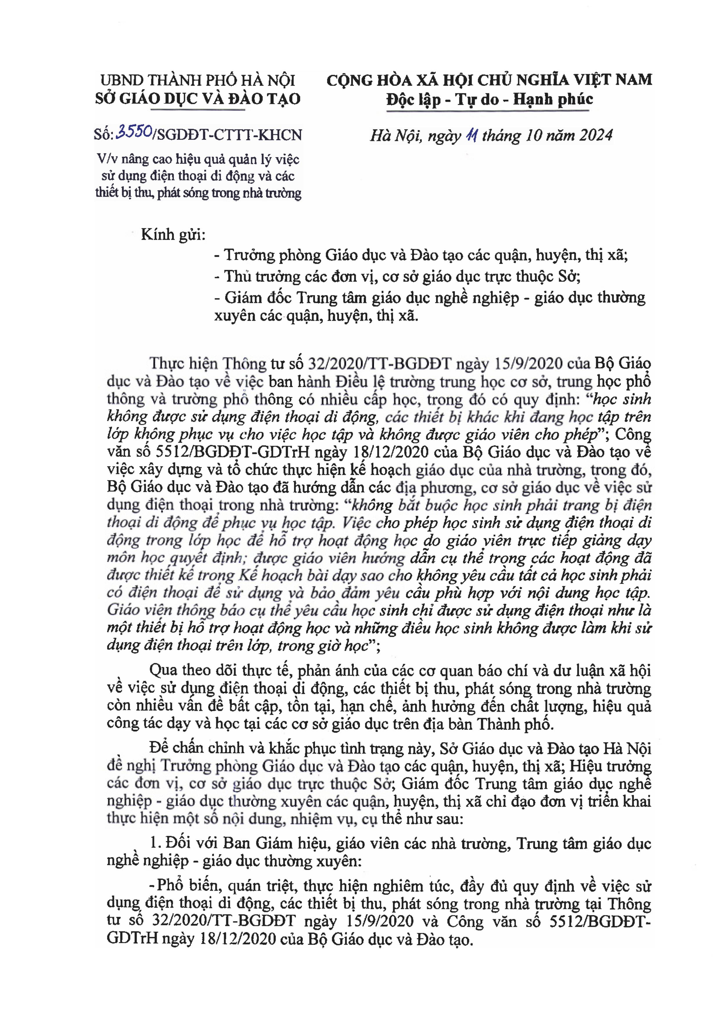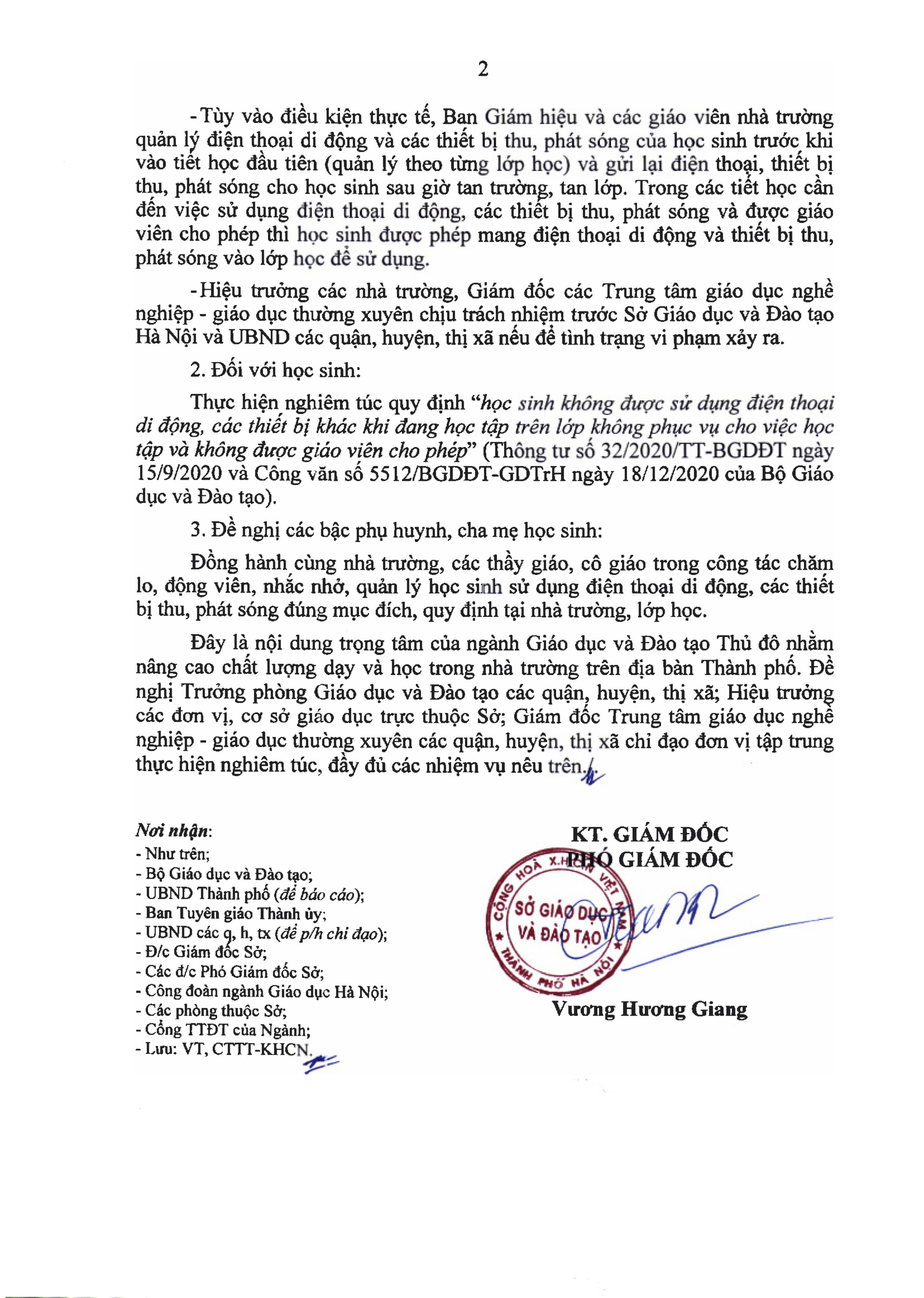 Thực hiện Thông tư số 32/2020/TT-BGDĐT ngày 15/09/2020 của Bộ Giáo dục và Đào tạo về việc ban hành Điều lệ trường trung học cơ sở, trung học phổ thông và trường phổ thông có nhiều cấp học, trong đó có quy định: "học sinh không được sử dụng điện thoại di động, các thiết bị khác khi đang học tập trên lớp không phục vụ cho việc học tập và không được giáo viên cho phép"....