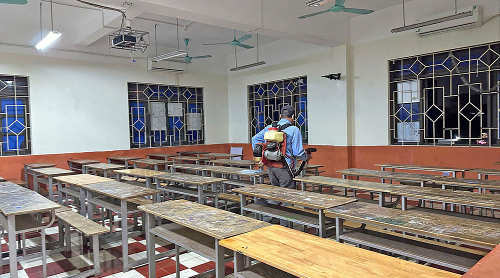 Nhân viên phun thuốc diệt muỗi tại phòng học