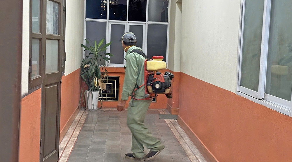Nhân viên phun thuốc diệt muỗi tại các hành lang