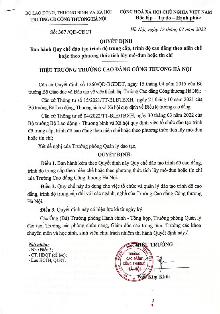 QUY CHẾ ĐÀO TẠO TRÌNH ĐỘ TRUNG CẤP, CAO ĐẲNG THEO NIÊN CHẾ HOẶC THEO PHƯƠNG THỨC TÍCH LŨY MO-DUN HOẶC TÍN CHỈTác giảTrung Tâm Thông tin &Truyền thông25/09/2023 - 13:30QUYẾT ĐỊNH Ban hành Quy chế đào tạo trình độ trung cấp, trình độ cao đẳng theo niên chế hoặc theo phương thức tích lũy mô-dun hoặc theo tín chỉ HIỆU TRƯỞNG TRƯỜNG CAO ĐẲNG CÔNG THƯƠNG HÀ NỘI Xem chi tiết tại đây!Thẻ bài viết:Quy chế đào tạo cao đẳng,quy chế đào tạo trung cấp,Quy chế đào tạoChia sẻ:
