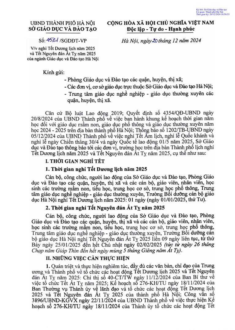 SỞ GDĐT HÀ NỘI: LỊCH NGHỈ TẾT DƯƠNG LỊCH NĂM 2025 VÀ TẾT NGUYÊN ĐÁN ẤT TỴ NĂM 2025Tác giảTrung Tâm Thông tin &Truyền thông08:30 - 30/12/2024Kính gửi: Phòng Giáo dục và Đào tạo các quận, huyện, thị xã Các đơn vị, cơ sở giáo dục trực thuộc Sở Giáo dục và Đào tạo Hà Nội Trung tâm giáo dục nghề nghiệp, giáo dục thường xuyên các quận, huyện, thị xã Thẻ bài viết:Sở GD ĐT Hà Nội,Lịch nghỉ tết dương lịch 2025 và tết nguyên đánChia sẻ: