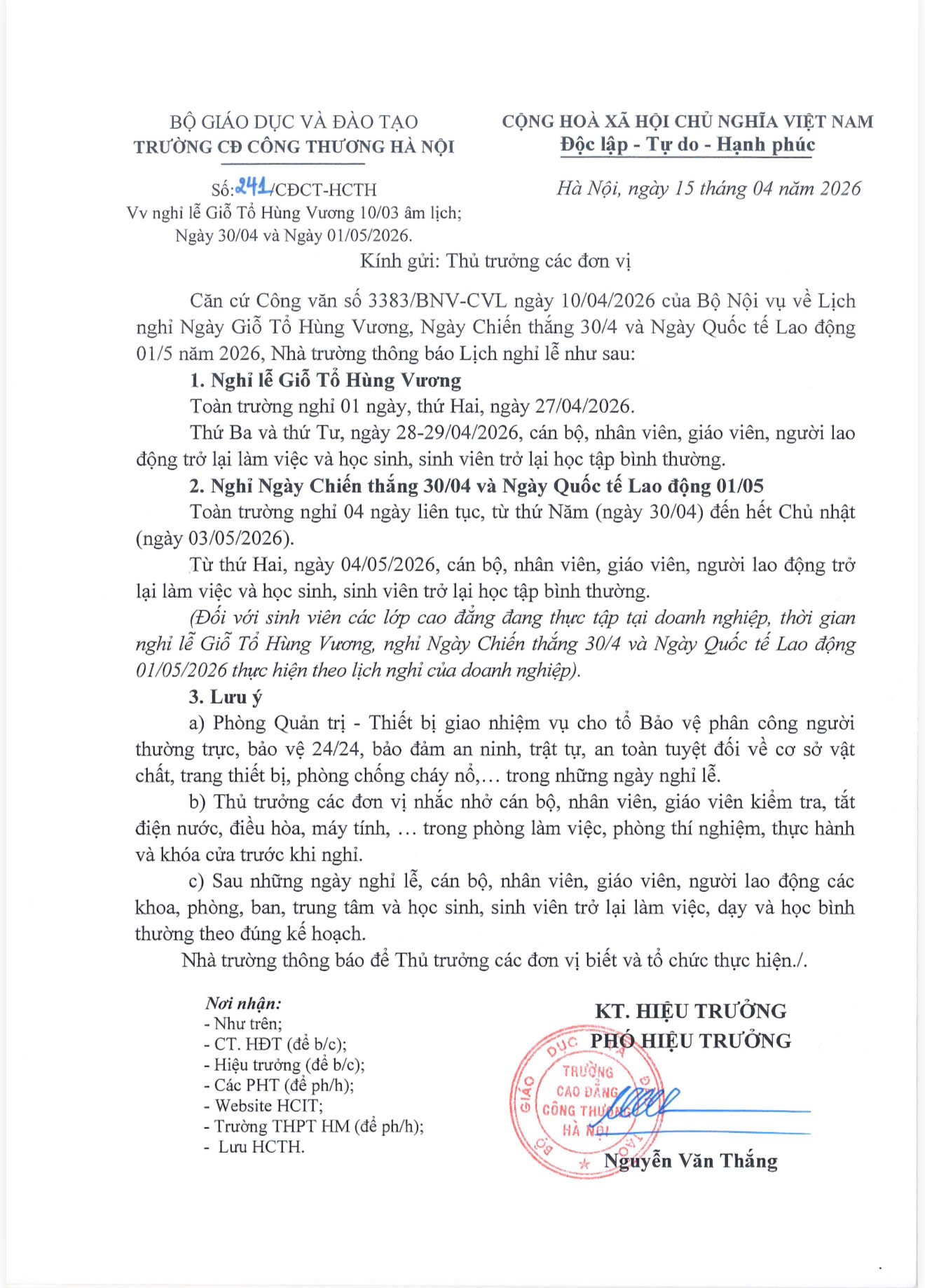 THÔNG BÁO LỊCH NGHỈ LỄ GIỖ TỔ HÙNG VƯƠNG, NGÀY CHIẾN THẮNG 30/4 VÀ NGÀY QUỐC TẾ LAO ĐỘNG 01/05/2026