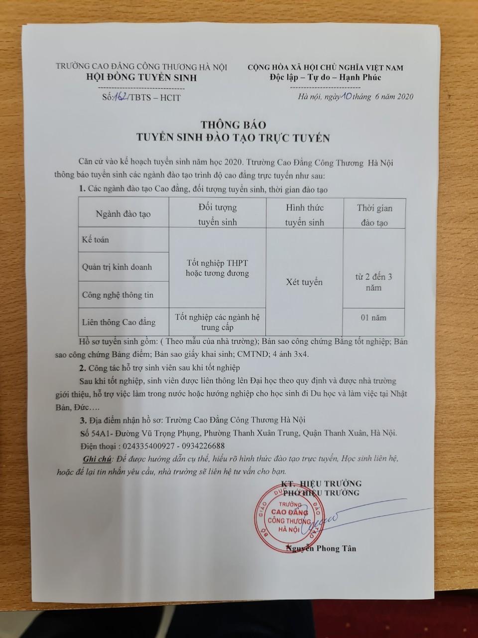 Trường Cao đẳng công thương Hà Nội thông báo tuyển sinh đào tạo trực tuyến đợt 2 năm 2020. Học và thi trực tuyến, bằng k ghi hình thức đào tạo