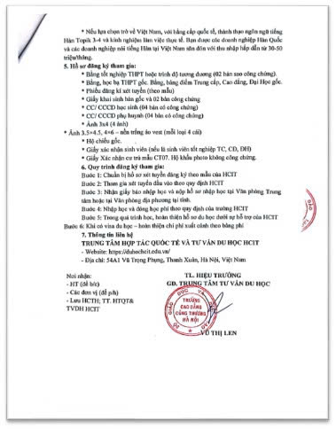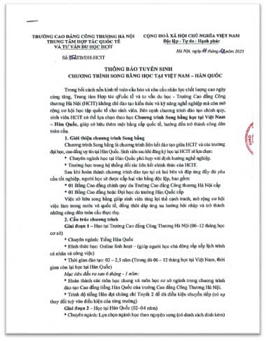 Trong bối cảnh hội nhập quốc tế sâu rộng và nhu cầu nhân lực chất lượng cao ngày càng tăng, Trung tâm Hợp tác quốc tế & Tư vấn du học HCIT - Trường Cao đẳng Công Thương Hà Nội chính thức triển khai Chương trình Song bằng học tại Việt Nam – Hàn Quốc.