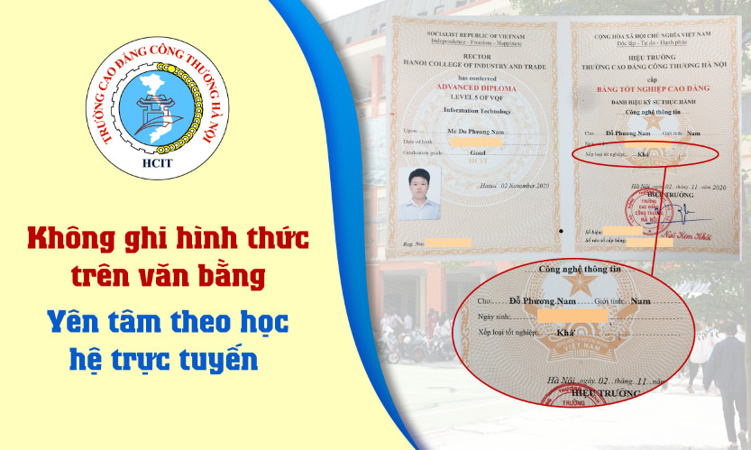(Theo Thông tư 33/2018/TT-BLĐTBXH ngày 26 tháng 12 năm 2018, sửa đổi, bổ sung về mẫu bằng tốt nghiệp “Bỏ nội dung “Hình thức đào tạo“ trong Mẫu bằng tốt nghiệp cao đẳng, Mẫu bằng tốt nghiệp trung cấp”, nghĩa là học chính quy, vừa học vừa làm, học offline hay online đều cấp bằng như nhau vì không ghi hình thức đào tạo) ( Xem chi tiết tại điều 10 mục 5)