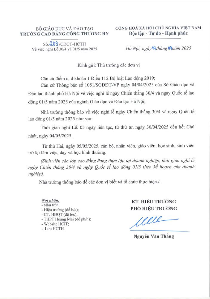 THÔNG BÁO VỀ VIỆC NGHỈ LỄ GIẢI PHÓNG MIỀN NAM 30/04 VÀ NGÀY QUỐC TẾ LAO ĐỘNG 01/05/2025Tác giảTrung Tâm Thông tin &Truyền thông16:26 - 14/04/2025Chi tiết như sau: Chia sẻ: