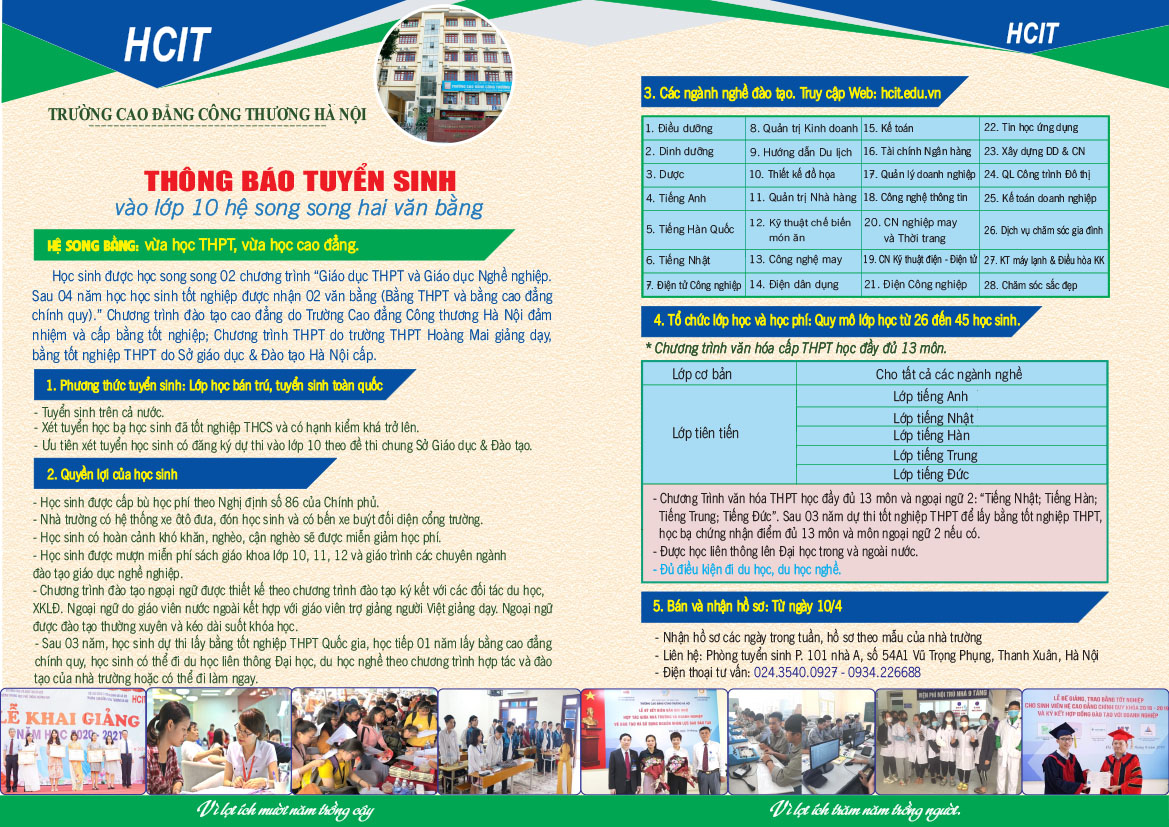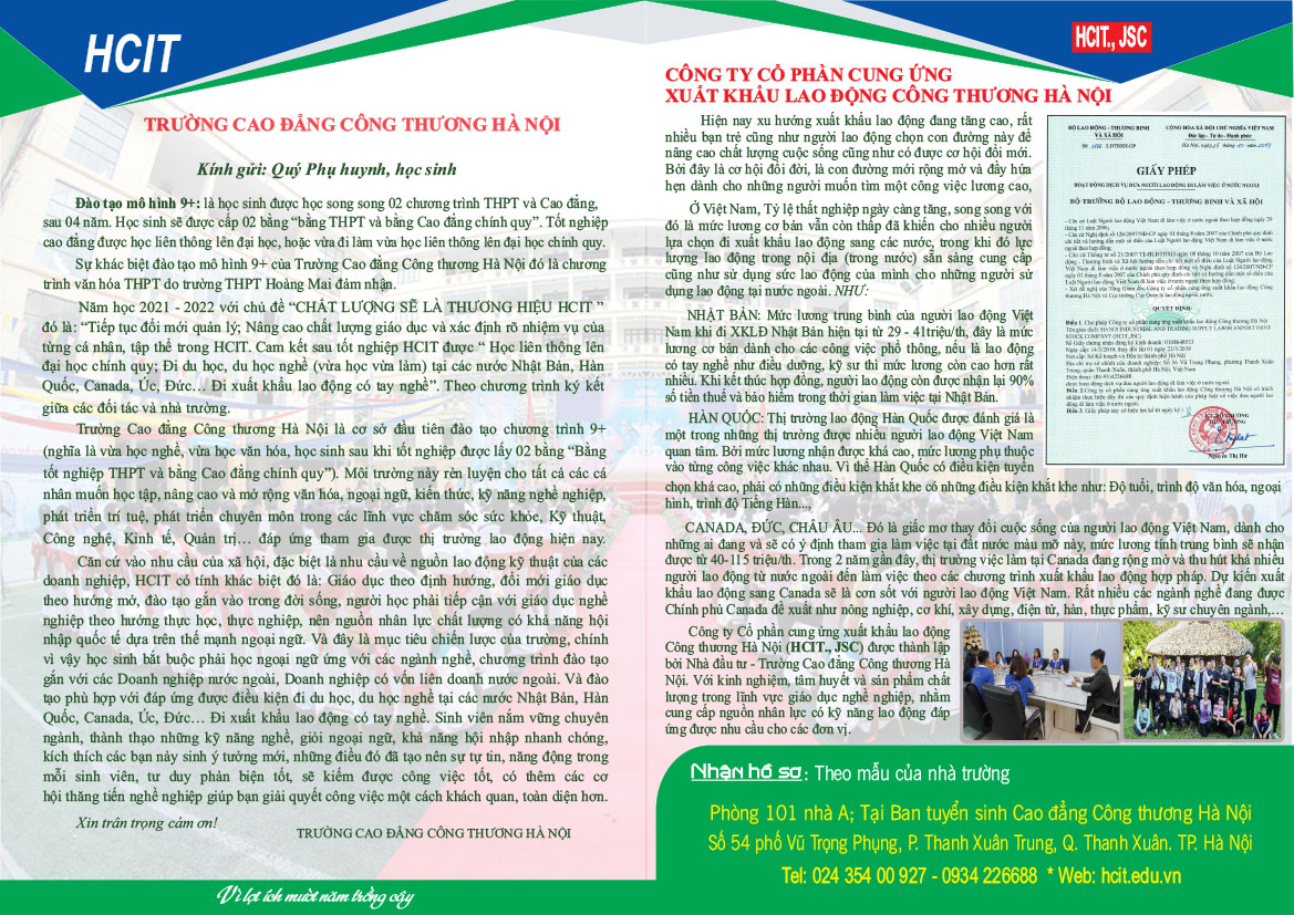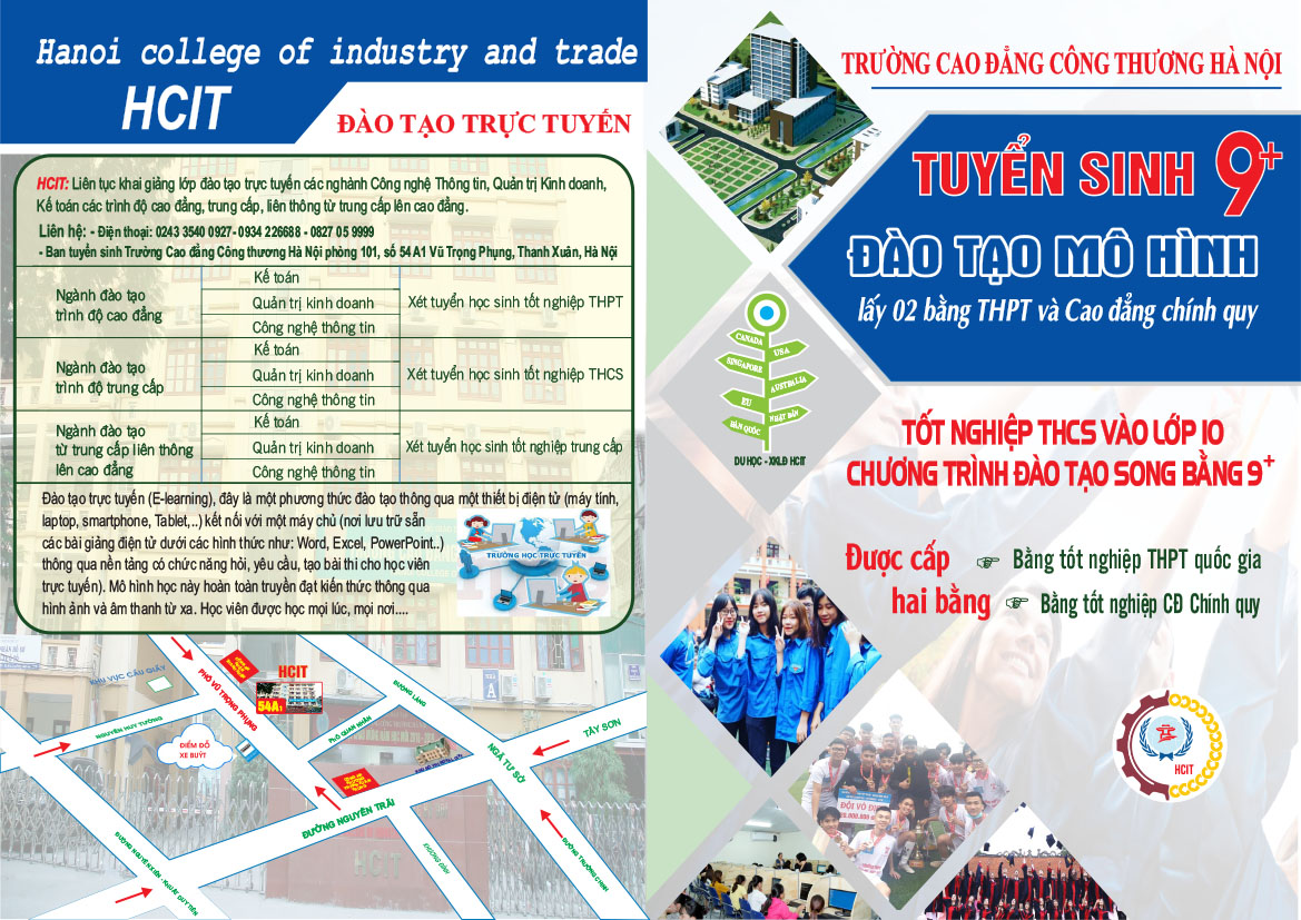 – Địa chỉ và điện thoại liên hệ: Phòng 101 (Ban tuyển sinh) Nhà A, Trường CĐ Công thương Hà Nội, Số 54A1, Vũ Trọng Phụng, Thanh Xuân, Thành phố Hà Nội.