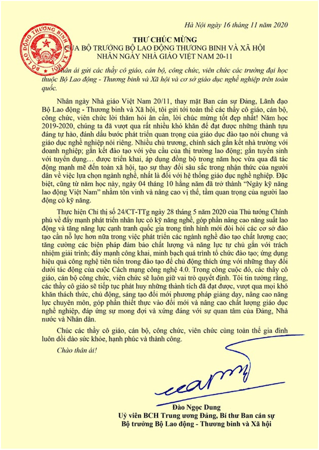 THƯ CHÚC MỪNG CỦA BỘ TRƯỞNG BỘ LAO ĐỘNG THƯƠNG BINH VÀ XÃ HỘI NHÂN NGÀY NHÀ GIÁO VIỆT NAM 20-1122:02 - 17/11/2020Thẻ bài viết:Thư chúc mừng 20/11 của Bộ trưởng Bộ LĐTBXHChia sẻ: