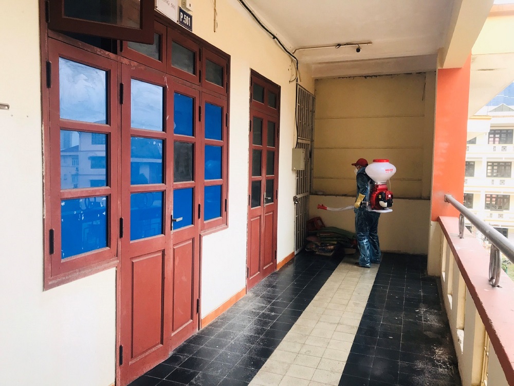 e) Ngắt điện máy điều hòa tất cả các phòng học; cắt nước các cây nước dùng chung tại các hành lang; tổ chức phun khử khuẩn phòng, chống dịch COVID-19, vệ sinh lau chùi lớp học, bàn ghế, bục bảng…;