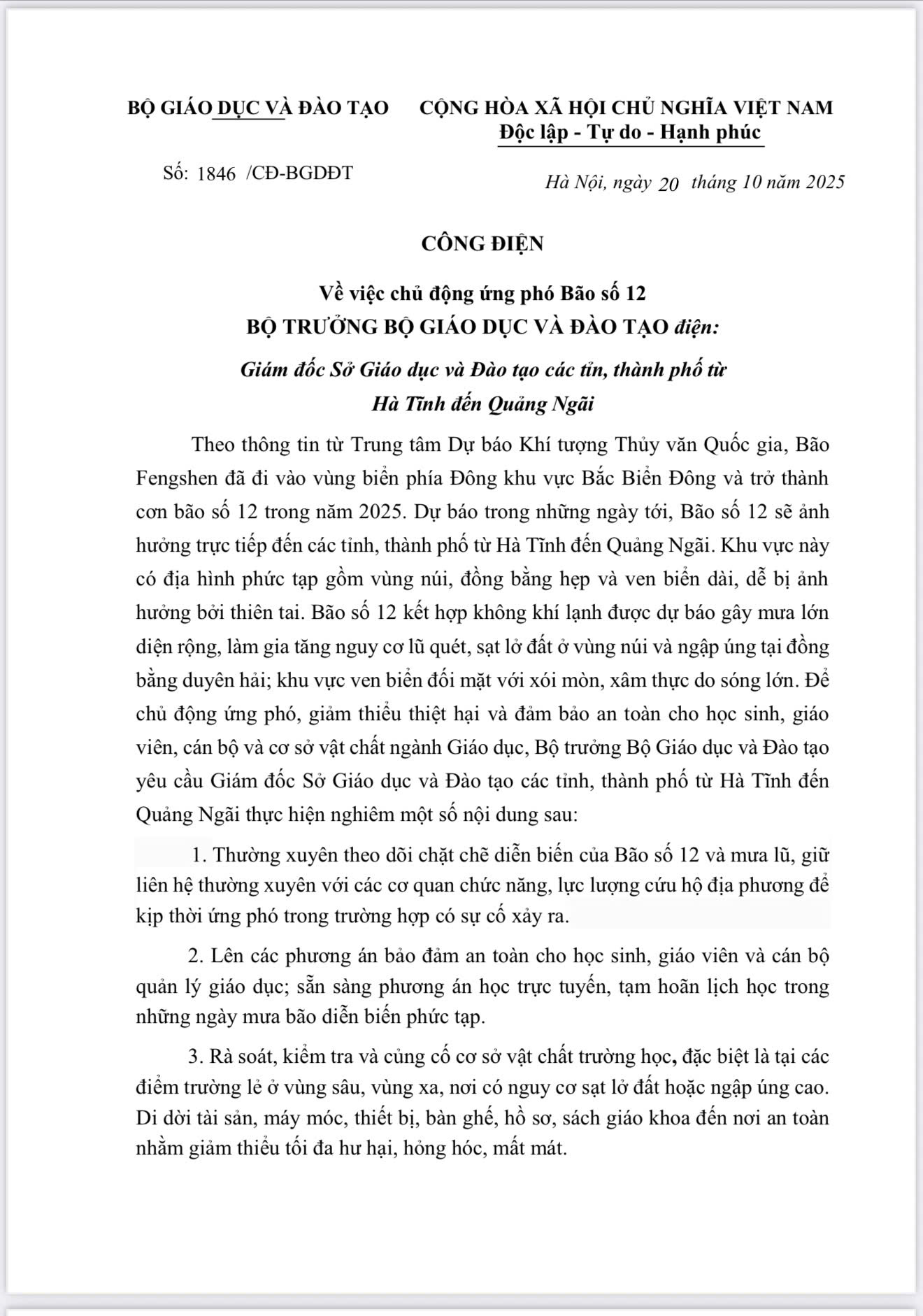 CÔNG ĐIỆN Về việc chru động ứng phó Bão số 12Tác giảTrung Tâm Thông tin &Truyền thông14:54 - 21/10/2025CÔNG ĐIỆN Về việc chru động ứng phó Bão số 12 Chia sẻ: