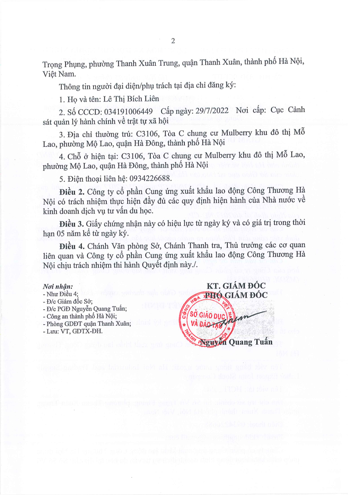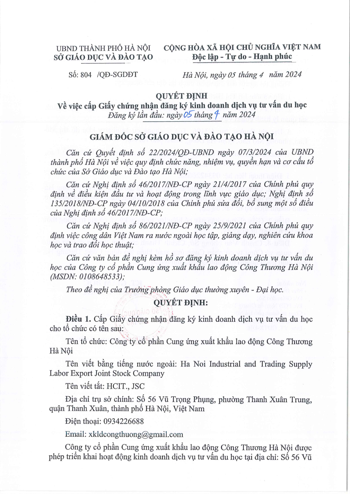 GIẤY PHÉP DU HỌCTác giảTrung Tâm Thông tin &Truyền thông15:33 - 23/12/2024Giấy chứng nhận đăng ký kinh doanh hoạt động tư vấn du học của Công ty cổ phần cung ứng xuất khẩu lao động công thương Hà Nội - Sở Giáo dục và Đào tạo Hà Nội Trang 1 Trang 2 Thẻ bài viết:Giấy phép du học,tư vân du họcChia sẻ: