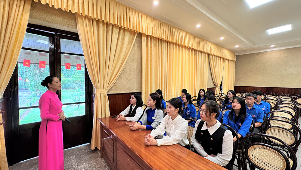 Cán bộ, giáo viên, học sinh, sinh viên nghe thuyết minh về các hình ảnh, tư liệu lịch sử gắn liền với sự nghiệp cách mạng của Chủ tịch Hồ Chí Minh