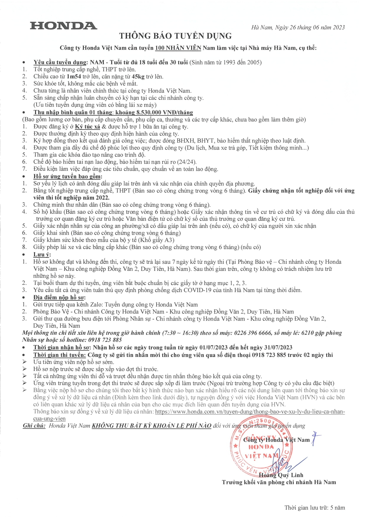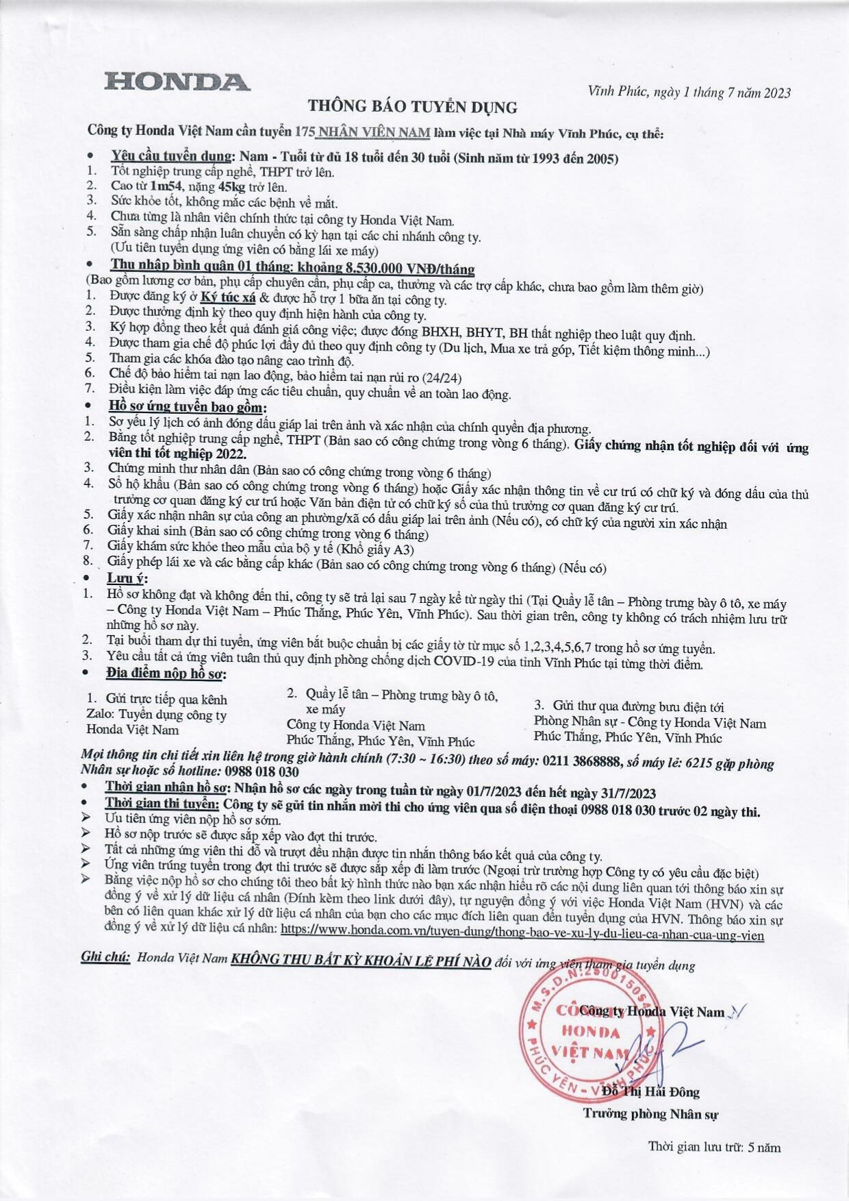 HONDA VIỆT NAM: THÔNG BÁO TUYỂN DỤNG LÀM VIỆC TẠI NHÀ MÁY VĨNH PHÚC VÀ HÀ NAM