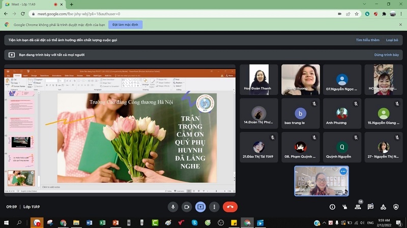 Thực hiện kế hoạch đào tạo và chương trình giáo dục học kỳ I, năm học 2021–2022, trong 02 ngày, thứ bảy (ngày 12/02/2022) và Chủ nhật (13/02/2022), Trường cao đẳng Công thương Hà Nội đã tổ chức họp phụ huynh học sinh các lớp nghề – Hệ đào tạo 2 văn bằng theo hình thức trực tuyến để thông báo kết quả học tập, rèn luyện học kỳ I và triển khai kế hoạch đào tạo học kỳ II năm học 2021-2022, đồng thời thông báo cho phụ huynh kế hoạch mở cửa trường, học sinh trở lại trường học trực tiếp từ ngày 14/02/2022 và hệ thống các giải pháp quản lý, giáo dục học sinh, cũng như các phương án phòng chống dịch COVID-19.