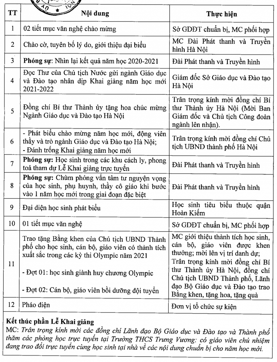 UBND TP Hà Nội vừa ban hành kế hoạch tổ chức khai giảng năm học mới 2021-2022. Theo đó, Thành phố tổ chức lễ khai giảng từ 7h30 – 8h30 ngày 5/9/2021 tại Trường THCS Trưng Vương (quận Hoàn Kiếm) và được truyền hình trực tiếp trên sóng của Đài PTTH Hà Nội để tất cả cán bộ, giáo viên, học sinh, cha mẹ học sinh và nhân dân trên địa bàn Thành phố được theo dõi.