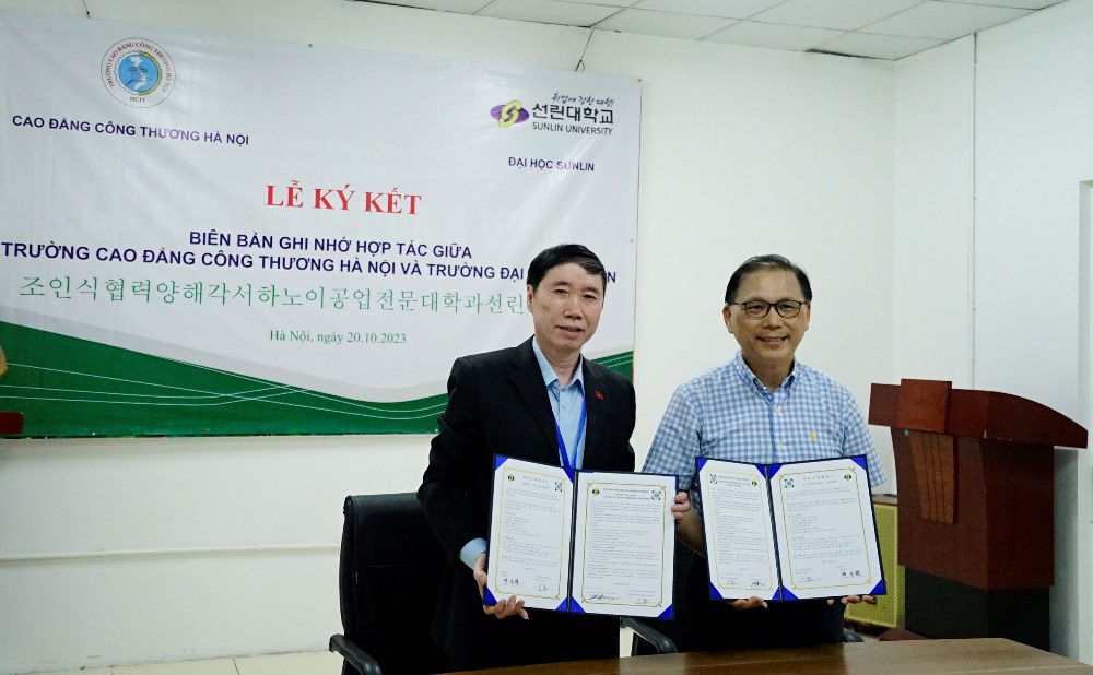Trên cơ sở nội dung Biên bản ghi nhớ về hợp tác đào tạo đã được lãnh đạo 2 trường thông qua, thay mặt Lãnh đạo Trường cao đẳng Công thương Hà Nội và thay mặt lãnh đạo trường Đại học Sunlin, 2 hiệu trưởng đã ký Biên bản ghi nhớ hợp tác đào tạo giữa 2 Trường.