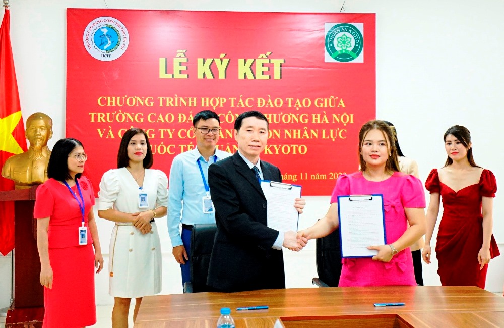 Trên cơ sở nội dung Biên bản ghi nhớ về hợp tác đào tạo đã được lãnh đạo 2 trường thông qua, thay mặt Lãnh đạo Trường Cao đẳng Công thương Hà Nội và thay mặt Ban giám đốc Công ty CP Nguồn nhân lực Quốc tế Thuận An Kyoto, Hiệu trưởng Ngô Kim Khôi và Phó tổng giám đốc Lê Thị Thanh Huyền đã ký Biên bản ghi nhớ hợp tác giữa hai đơn vị.