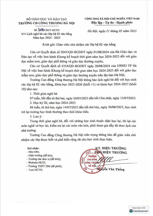 LỊCH NGHỈ HÈ CÁC LỚP HỆ 2 VĂN BẰNG NĂM HỌC 2024-2025Tác giảTrung Tâm Thông tin &Truyền thông10:08 - 22/05/2025CHI TIẾT NHƯ SAU: Chia sẻ: