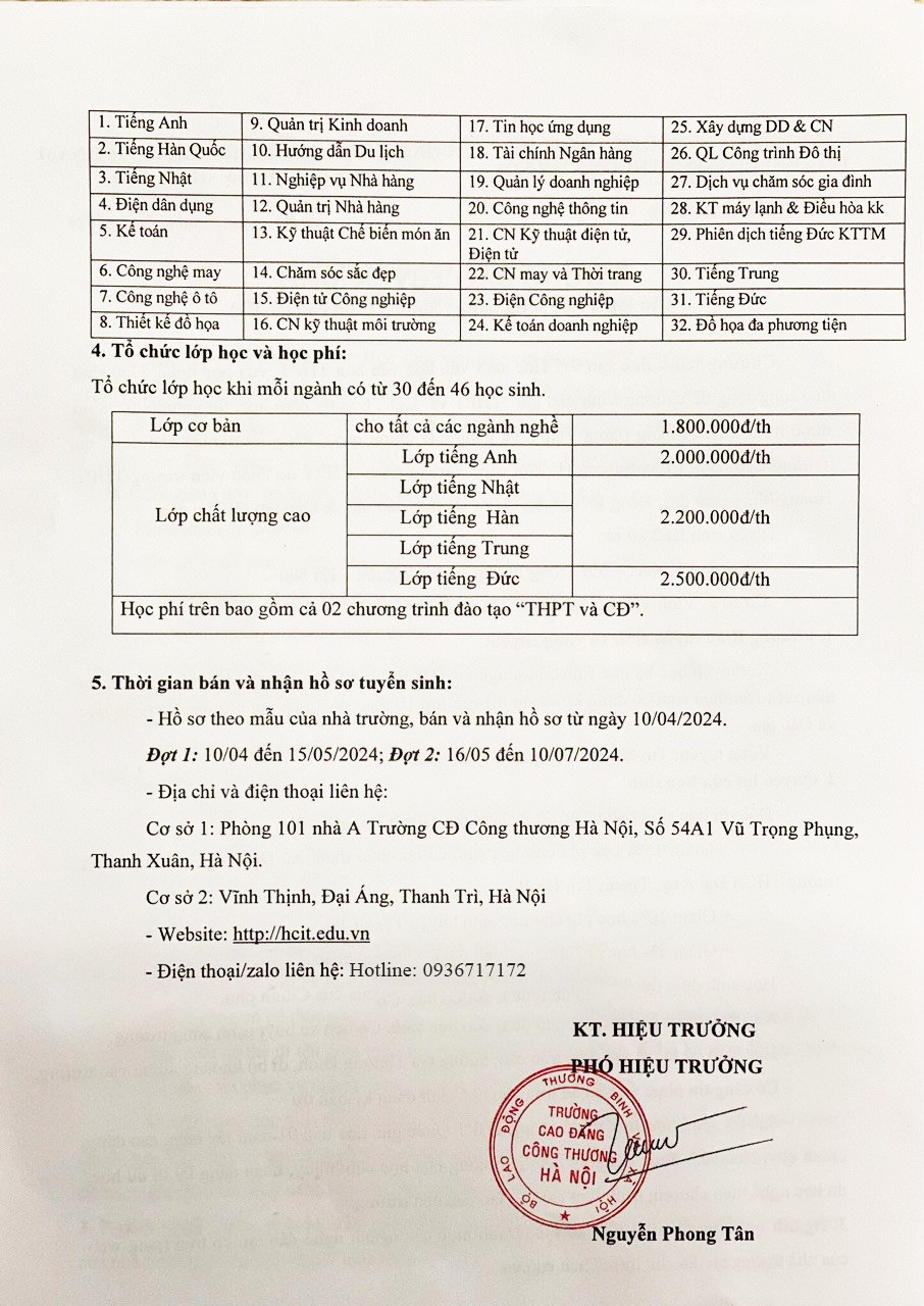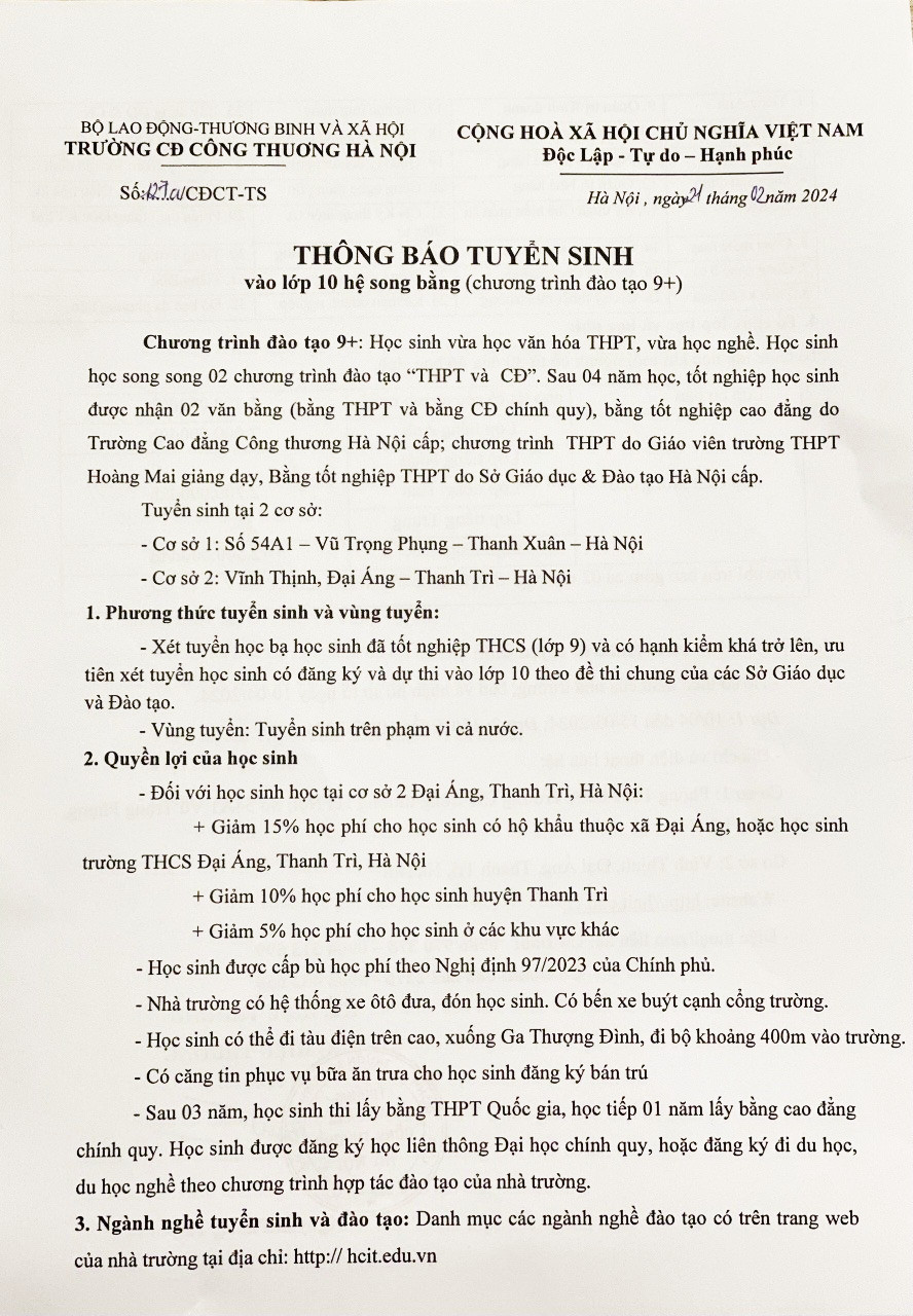 Chương trình đào tạo 9+: Học sinh vừa học văn hóa THPT, vừa học nghề. Học sinh học song song 02 chương trình đào tạo "THPT và cao đẳng". Sau 04 năm học, tốt nghiệp học sinh được nhận 02 văn bằng (Bằng THPT và bằng Cao đẳng chính quy). Bằng tốt nghiệp cao đẳng do Trường cao đẳng Công thương Hà Nội cấp; chương trình THPT do giáo viên trường THPT Hoàng Mai giảng dạy; bằng tốt nghiệp THPT do Sở Giáo dục & Đào tạo Hà Nội cấp.