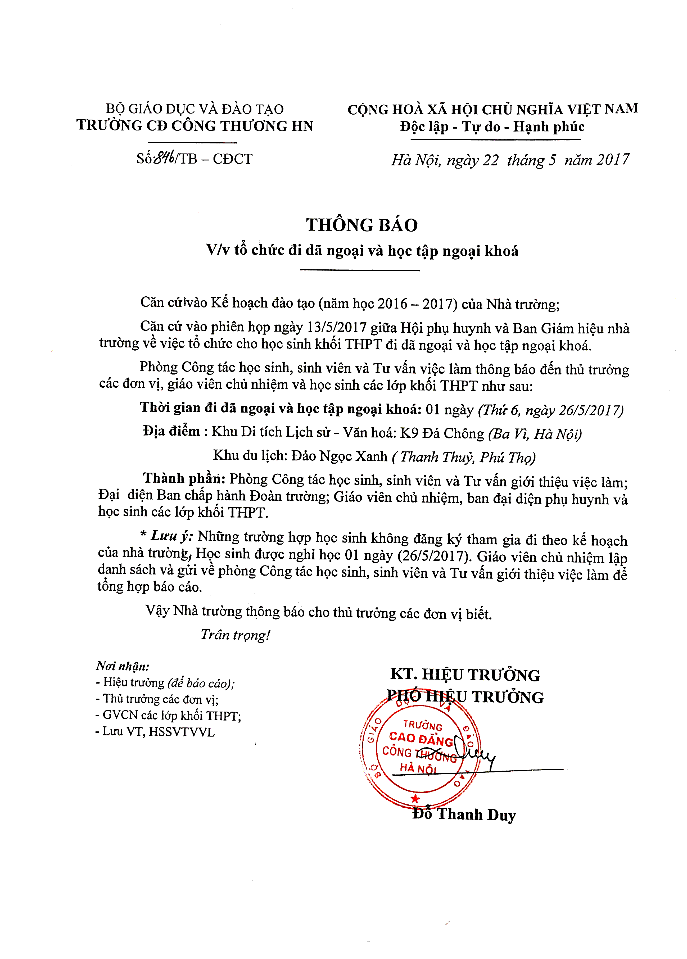 THÔNG BÁO VỀ VIỆC ĐI DÃ NGOẠI VÀ HỌC TẬP NGOẠI KHÓA10:15 - 24/05/2017Thông báo v/v tổ chức đi dã ngoại và học tập ngoại khóa Chia sẻ: